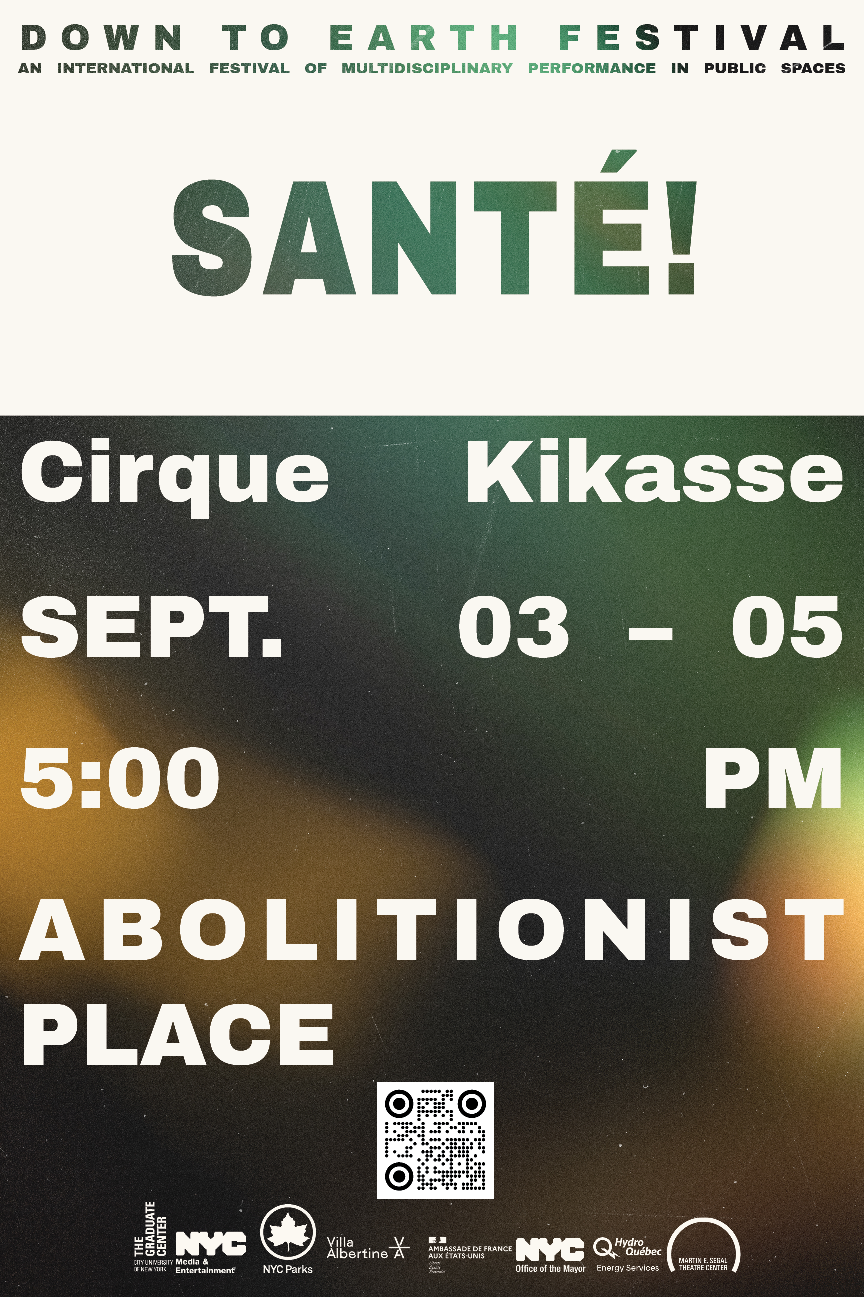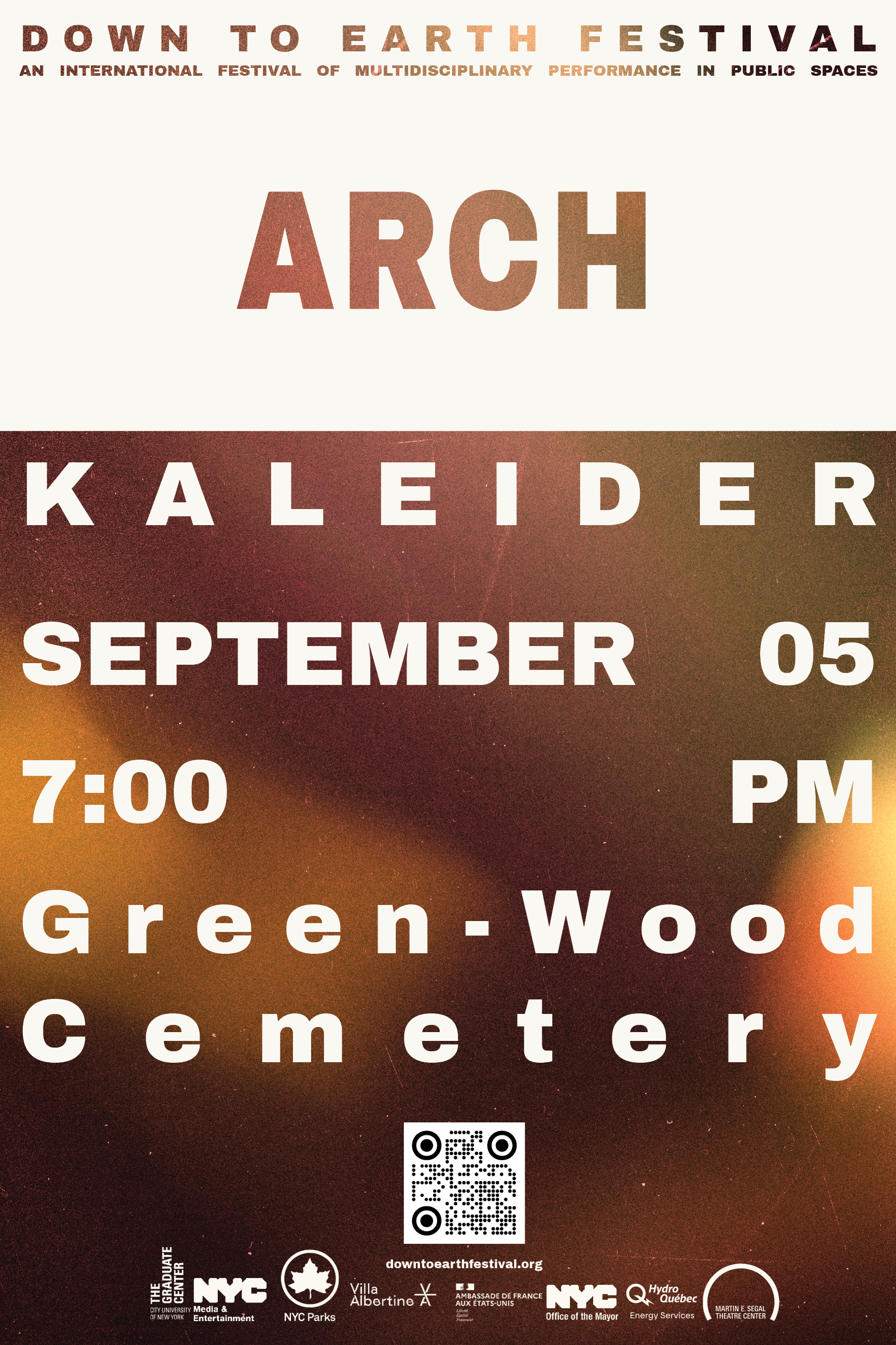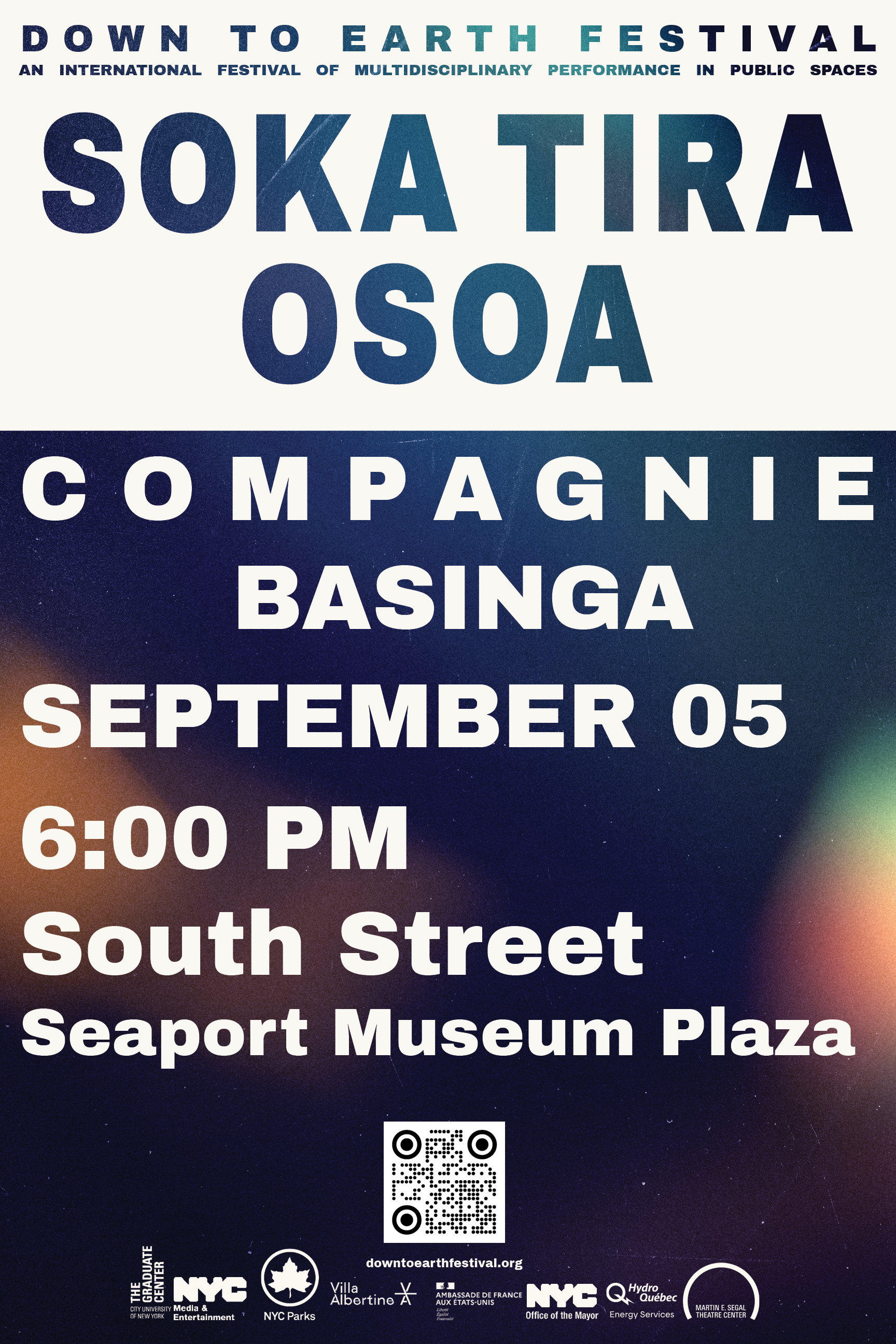Anchoring this foundation is a bold top tab—an assertive block with knocked-out lettering that clearly signals the festival brand. From there, large-scale typography cascades through the composition in a dynamic hierarchy, guiding the viewer from headline to detail with clarity and momentum. The layout resolves with a QR code and sponsor acknowledgments, integrating utility and partnership directly into the visual system.